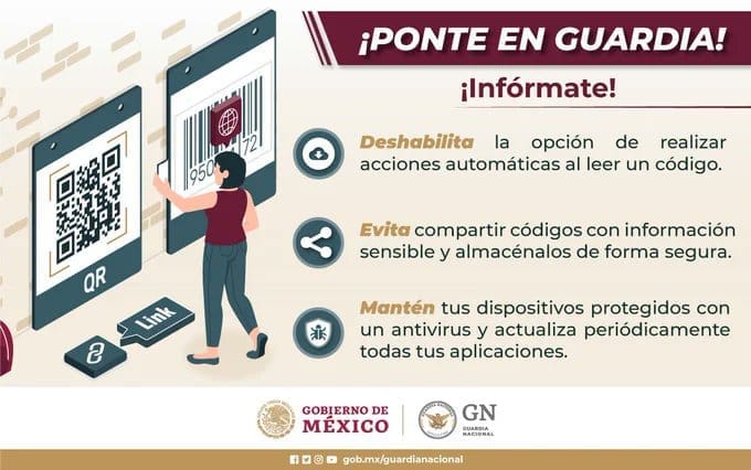 - – Mantén tus dispositivos protegidos con un antivirus y actualiza periódicamente todas tus aplicaciones. Aquí tiene un link para protegerte: https://www.gob.mx/gncertmx/articulos/fraude-a-traves-del-uso-de-codigos-qr