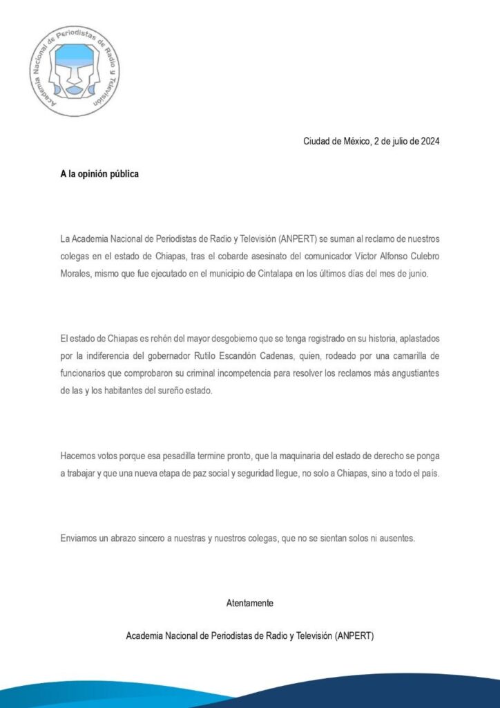 Los integrantes de la Academia Nacional de Periodistas de Radio y Televisión se suman a la condena del asesinato del Colega Víctor Alfonso Culebro Morales. Quien fue ejecutado en el municipio de Cintalapa a finales de junio.