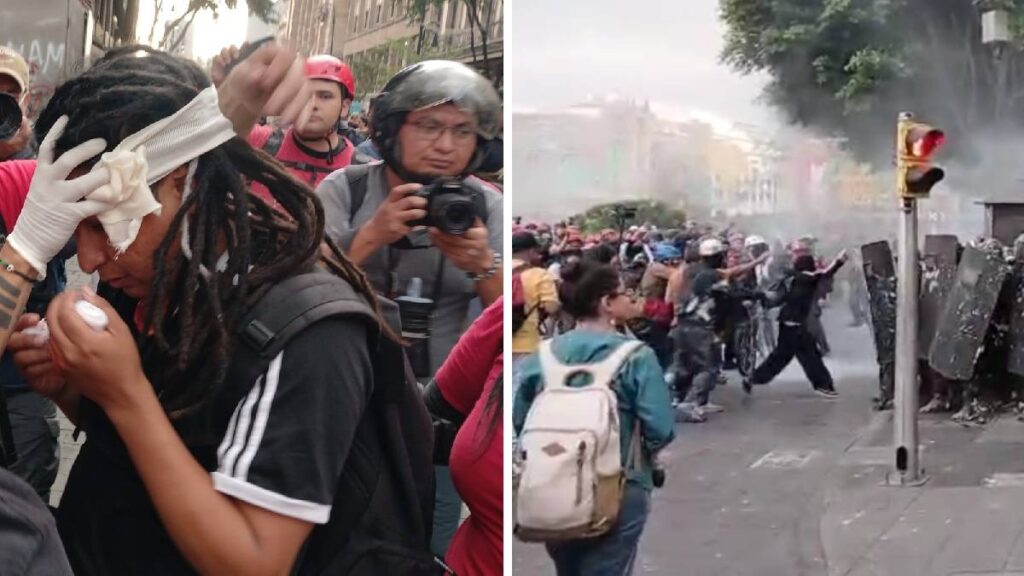 Al llegar al Zócalo, los manifestantes se dividieron: mientras algunos buscaban mantener una protesta pacífica, otros —identificados como “bloque negro” o “anarquistas”— lanzaron piedras, cohetones, bombas molotov y cubetas de pintura contra los cuerpos de seguridad.